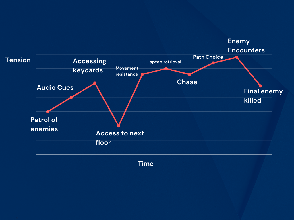 I produced a infiltration type level design and explored different ideas and took inspiration from levels within Watch Dogs and GTA V. The use of a pacing chart was crucial when planning levels to ensure tension rose and dropped consistently whilst also considering flow with this. Using different devices to guide player movement such as spatially configuring certain areas of the level caused differentiation within the players gameplay.