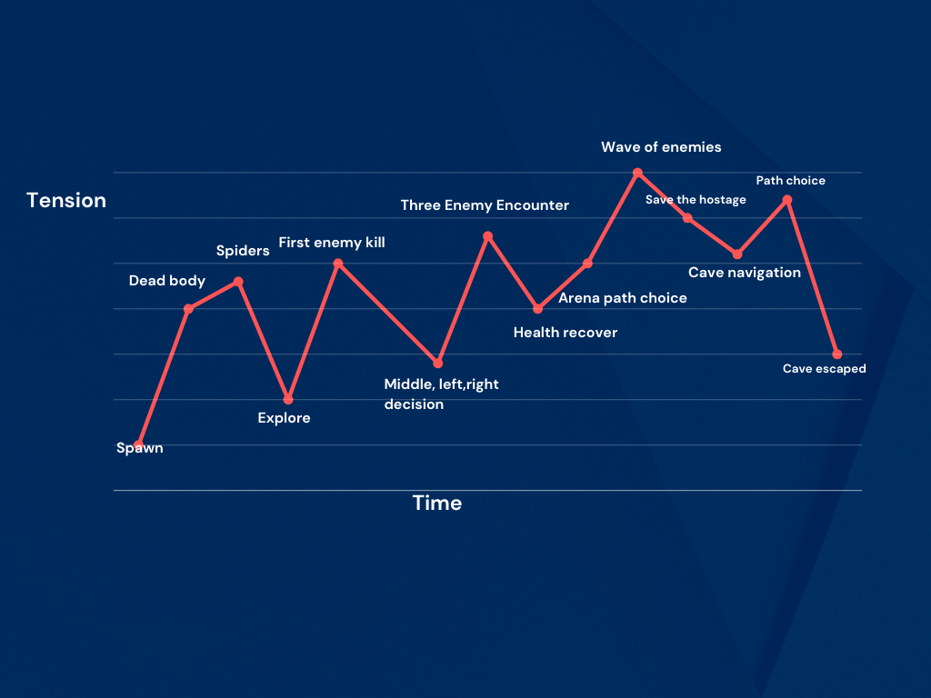 This cave-themed level combines exploration, combat, and survival mechanics to create a challenging and immersive experience. Players begin by navigating a relatively calm environment, gradually transitioning into intense combat zones with increasing difficulty. The level features strategic chokepoints, alternate routes, and a central arena to build tension, with a unique hunger mechanic adding urgency. The architecture is a blend of linear and hub-and-spoke designs, guiding players through environmental hazards, enemy encounters, and timed challenges. Players must balance stealth and aggression as they navigate the cave, ultimately escaping after saving a hostage and overcoming the final threats.
